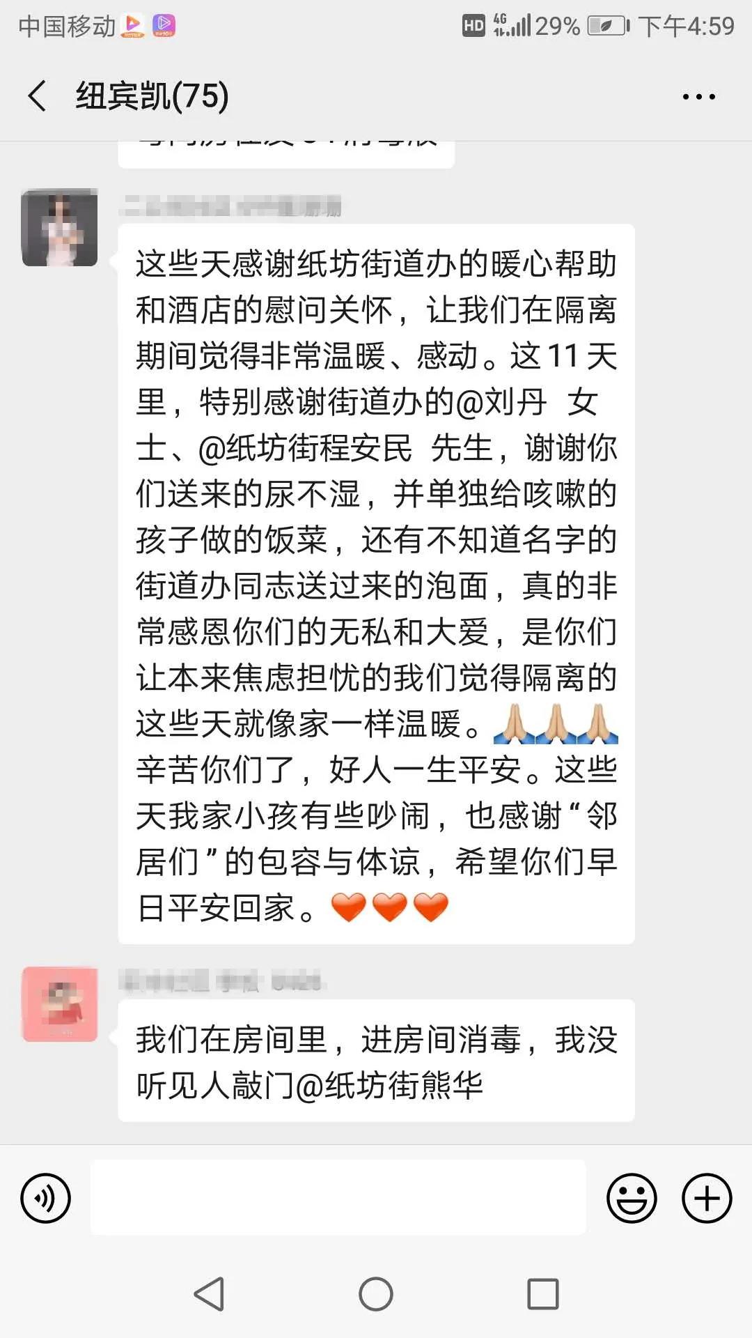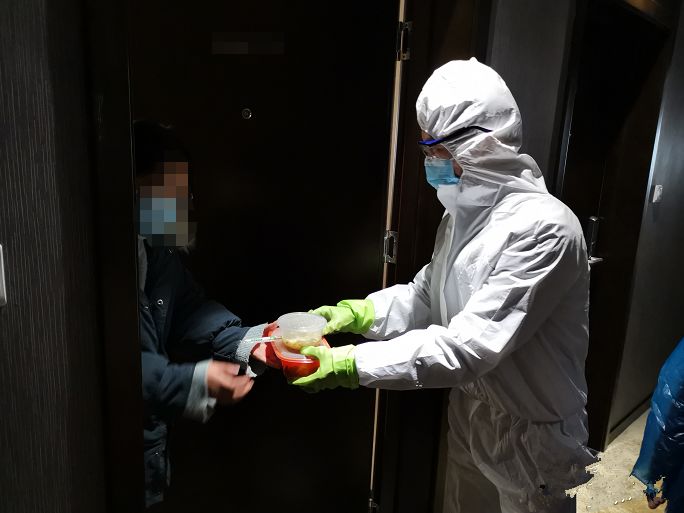 近一周的安置工作,我所在的隔離點共接收密切接觸者110多人,轉(zhuǎn)診6人,每天持續(xù)工作18-20小時,送餐、發(fā)藥、測體溫,四層隔離樓房124間觀察對象房間,我們五個人都要服務(wù)到位,有時還要和他們在微信群里進行心理疏導(dǎo)。
