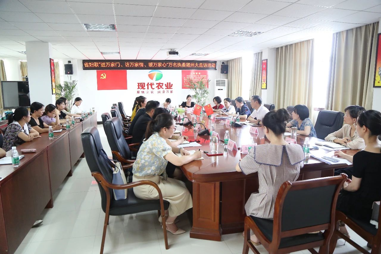 隨后,傅江浩一行和市婦聯(lián)領(lǐng)導(dǎo)、隨縣婦聯(lián)執(zhí)委代表們在現(xiàn)代農(nóng)業(yè)會議室召開了“進(jìn)萬家門、訪萬家情、暖萬家心”萬名執(zhí)委隨縣大走訪座談會,會議由省婦聯(lián)權(quán)益部部長徐九中同志主持,隨縣婦聯(lián)主席姚紅同志、現(xiàn)代農(nóng)業(yè)總經(jīng)理姚莎莎及其他執(zhí)委代表作了工作匯報(bào)。