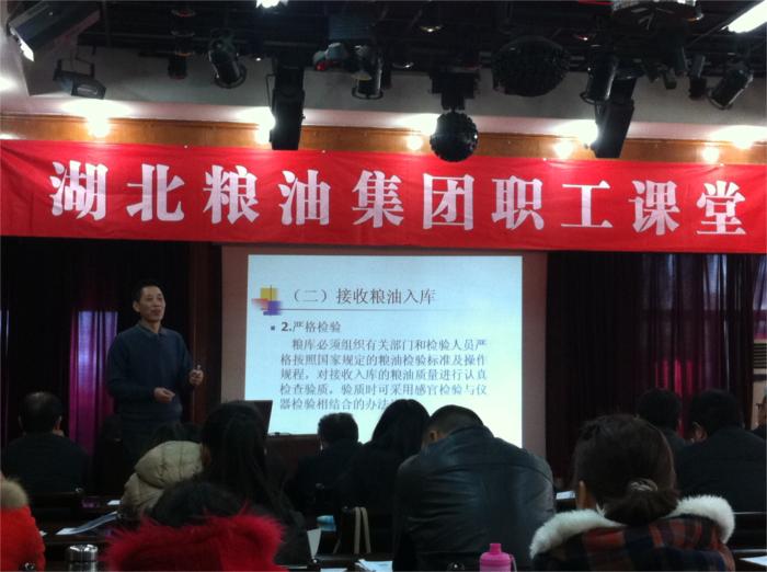 2013年11月29日,湖北省糧油集團(tuán)舉辦了一期糧油倉儲和檢化驗基礎(chǔ)知識培訓(xùn),聘請湖北大學(xué)知行學(xué)院汪浩明老師和湖北省糧油食品質(zhì)量監(jiān)測站熊寧站長授課。集團(tuán)各子企業(yè)糧油倉儲管理和檢化驗等相關(guān)崗位工作人員以及本部員工54人參加了培訓(xùn)。兩位老師主要講授了糧油出入庫、儲存的主要步驟和操作要點,糧庫安全管理、倉儲機械管理的相關(guān)制度,以及糧油質(zhì)量管理與監(jiān)測、稻谷和小麥質(zhì)量及儲存品質(zhì)檢驗等方面的知識。