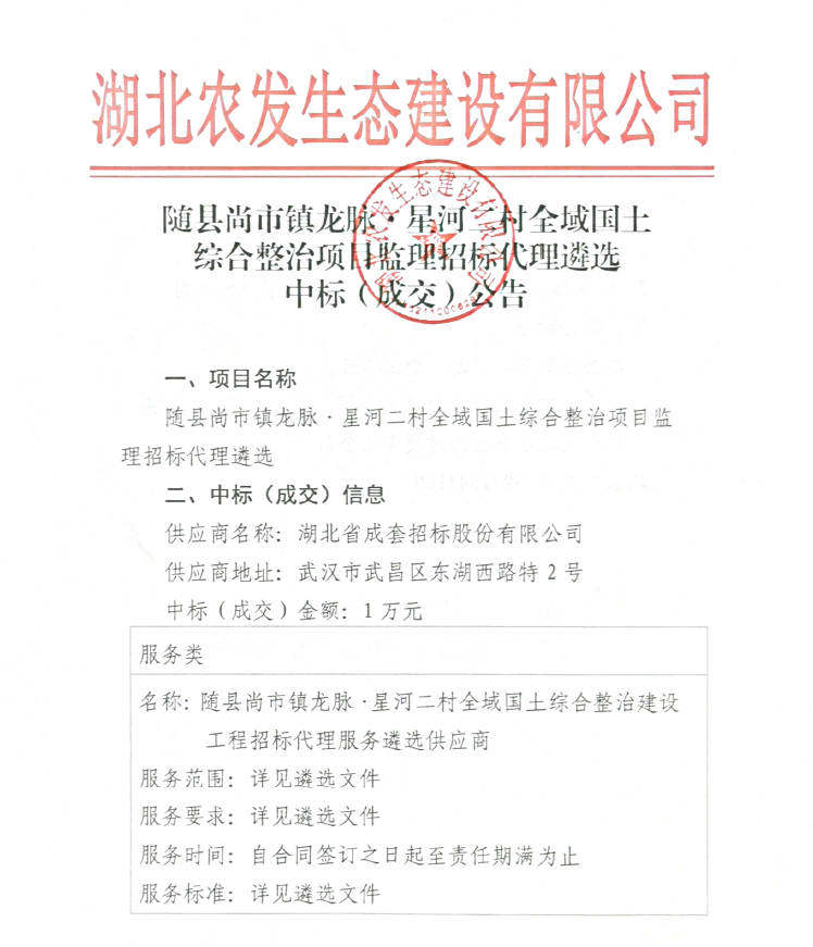 中標(biāo)公告---隨縣尚市鎮(zhèn)龍脈·星河二村全域國土綜合整治項(xiàng)目監(jiān)理招標(biāo)代理遴選