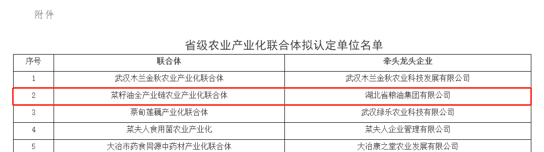 為充分發(fā)揮省級農(nóng)業(yè)產(chǎn)業(yè)化聯(lián)合體示范作用,通過緊密的利益連接帶動農(nóng)民增收、促進共同富裕,近日,省農(nóng)業(yè)農(nóng)村廳公示了2022年省級農(nóng)業(yè)產(chǎn)業(yè)化聯(lián)合體名單,湖北省糧油集團有限公司牽頭的菜籽油全產(chǎn)業(yè)鏈農(nóng)業(yè)產(chǎn)業(yè)化聯(lián)合體及湖北小龍蝦產(chǎn)業(yè)控股集團牽頭的小龍蝦農(nóng)業(yè)產(chǎn)業(yè)化聯(lián)合體成功入選其中,為農(nóng)業(yè)產(chǎn)業(yè)鏈進一步延鏈補鏈強鏈,促進湖北農(nóng)業(yè)產(chǎn)業(yè)鏈高質(zhì)量發(fā)展,發(fā)揮龍頭企業(yè)帶動作用。此前,由湖北省糧油集團牽頭省內(nèi)32家市場主體成立優(yōu)質(zhì)稻米全產(chǎn)業(yè)鏈農(nóng)業(yè)產(chǎn)業(yè)化聯(lián)合體已被農(nóng)業(yè)農(nóng)村部評為國家級示范聯(lián)合體。