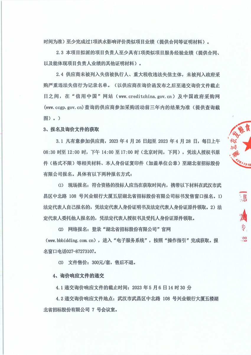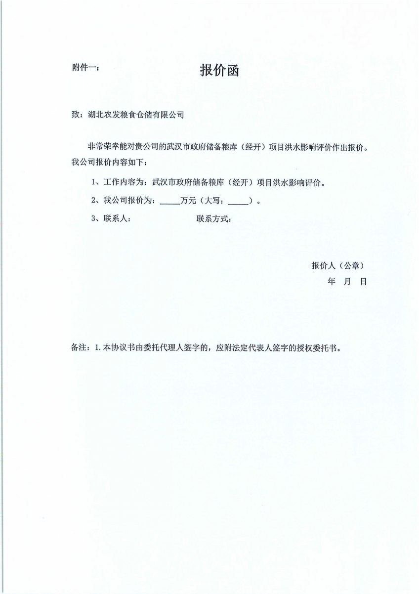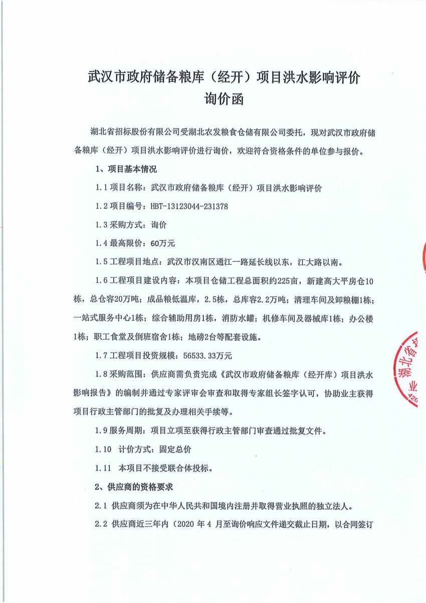 武漢市政府儲(chǔ)備糧庫(kù)(經(jīng)開)項(xiàng)目防洪評(píng)價(jià)詢價(jià)函