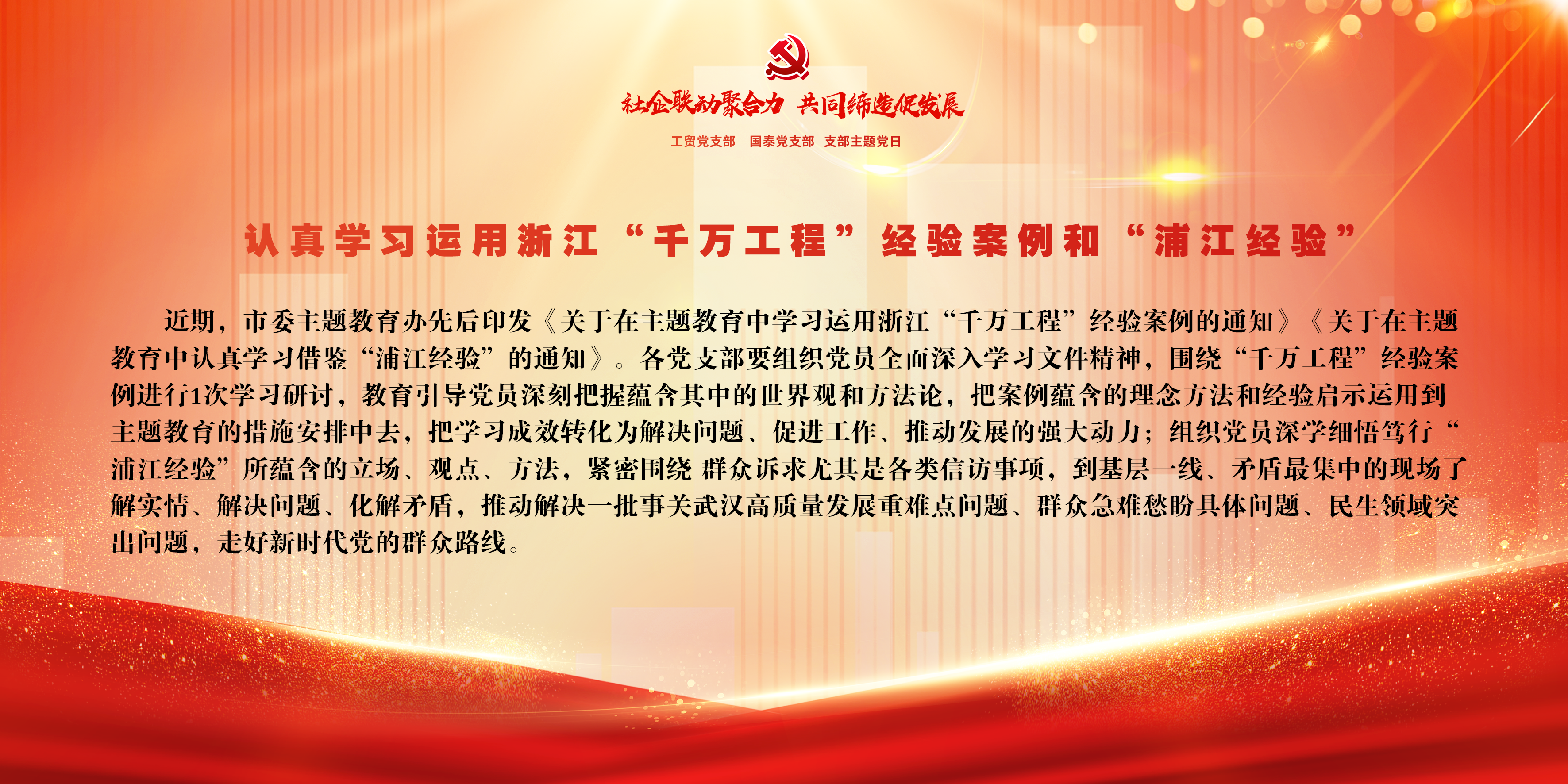 武湖街道黨工委書記程壯對本次聯(lián)合支部主題黨日活動進行了點評,他指出,轄區(qū)內(nèi)黨組織要向國泰黨支部、工貿(mào)黨支部學(xué)習(xí),旗幟鮮明,抓好新時代黨建工作,不斷優(yōu)化營商環(huán)境,引領(lǐng)區(qū)域高質(zhì)量發(fā)展。他要求,各級黨組織要持續(xù)深化黨建引領(lǐng),不斷改進工作方式,共建、共治、共享,聚合力、促發(fā)展,以企促社、以社帶企,推動社企同頻共振、互促共贏。