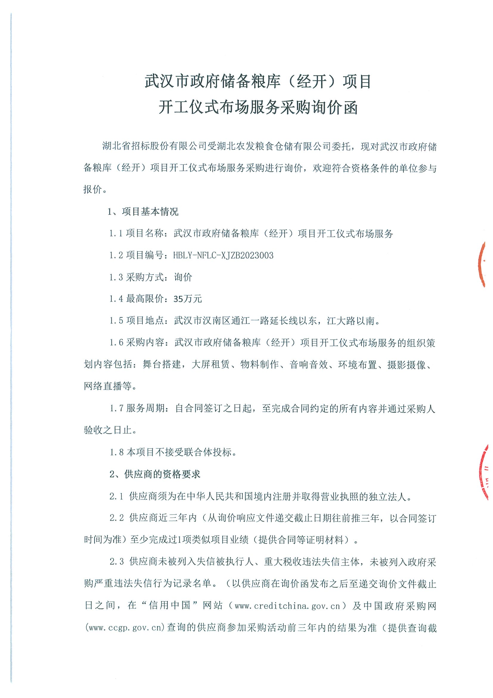 武漢市政府儲備糧庫(經(jīng)開)項目開工儀式布場服務(wù)采購詢價函
