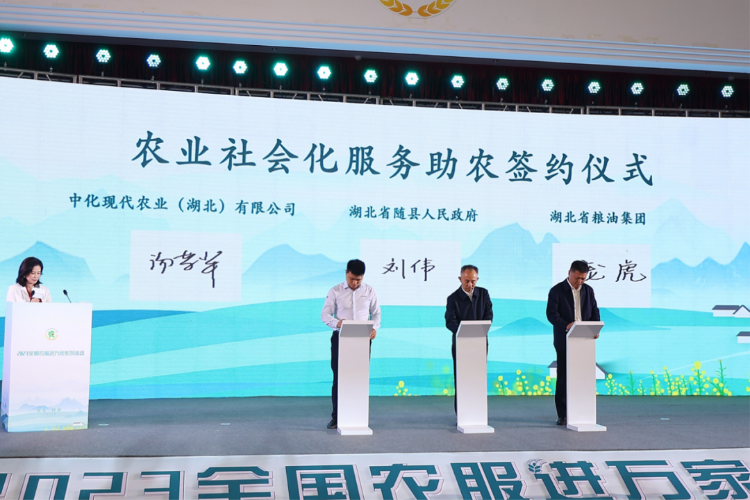 現(xiàn)場舉行了隨縣農(nóng)業(yè)社會化服務(wù)助農(nóng)簽約儀式,湖北省隨縣縣委副書記、縣長劉偉,湖北省糧油集團(tuán)有限公司黨委副書記、總經(jīng)理龐虎,中化現(xiàn)代農(nóng)業(yè)(湖北)有限公司副總經(jīng)理湯榮輝共同登臺簽約。