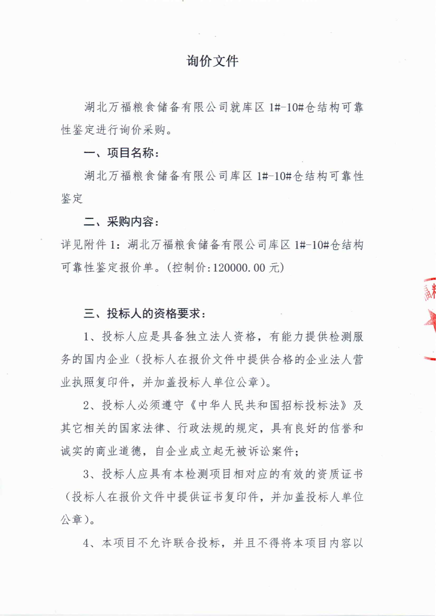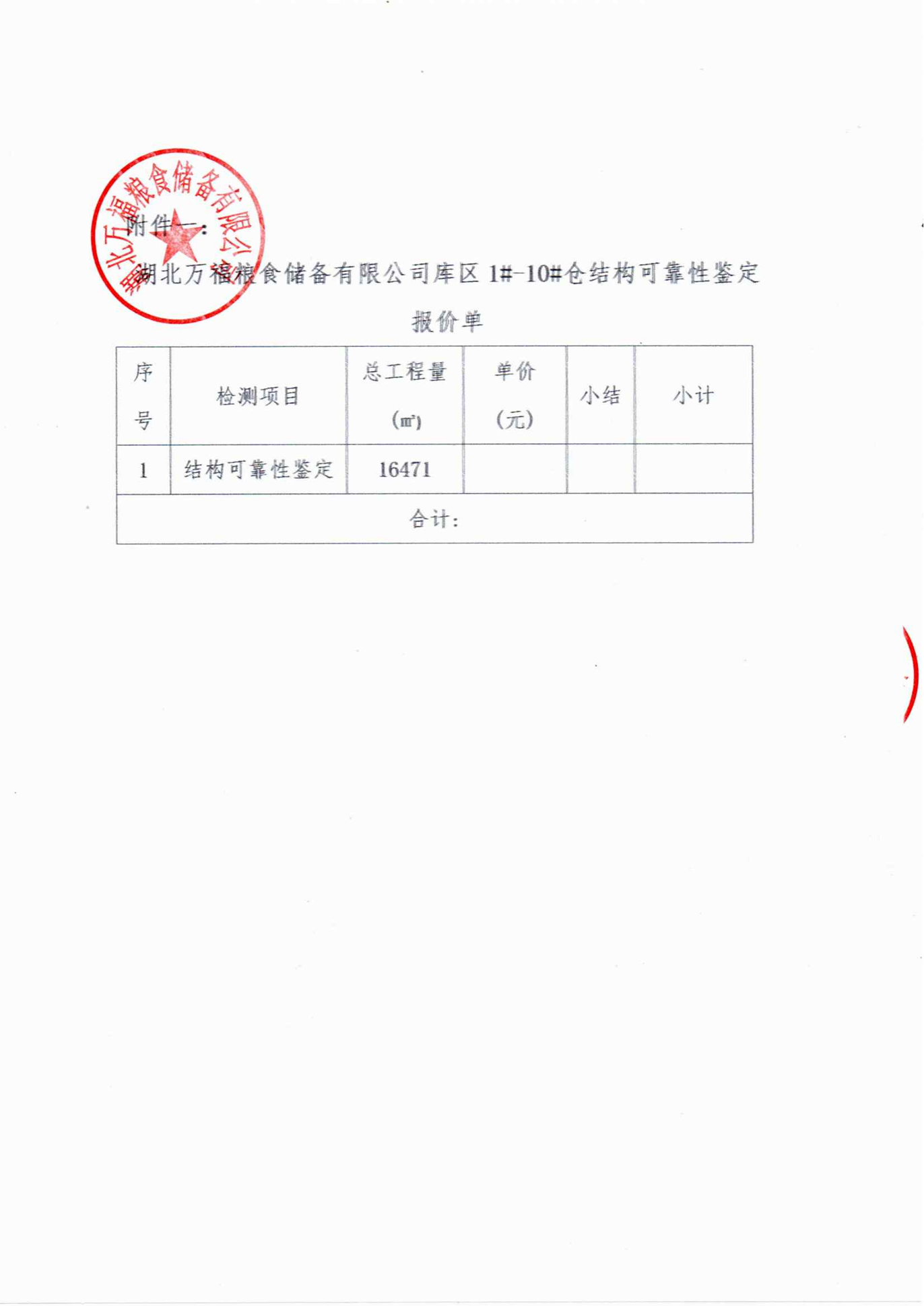 湖北萬福糧食儲(chǔ)備有限公司庫區(qū)1#-10#倉(cāng)結(jié)構(gòu)可靠性鑒定詢價(jià)文件
