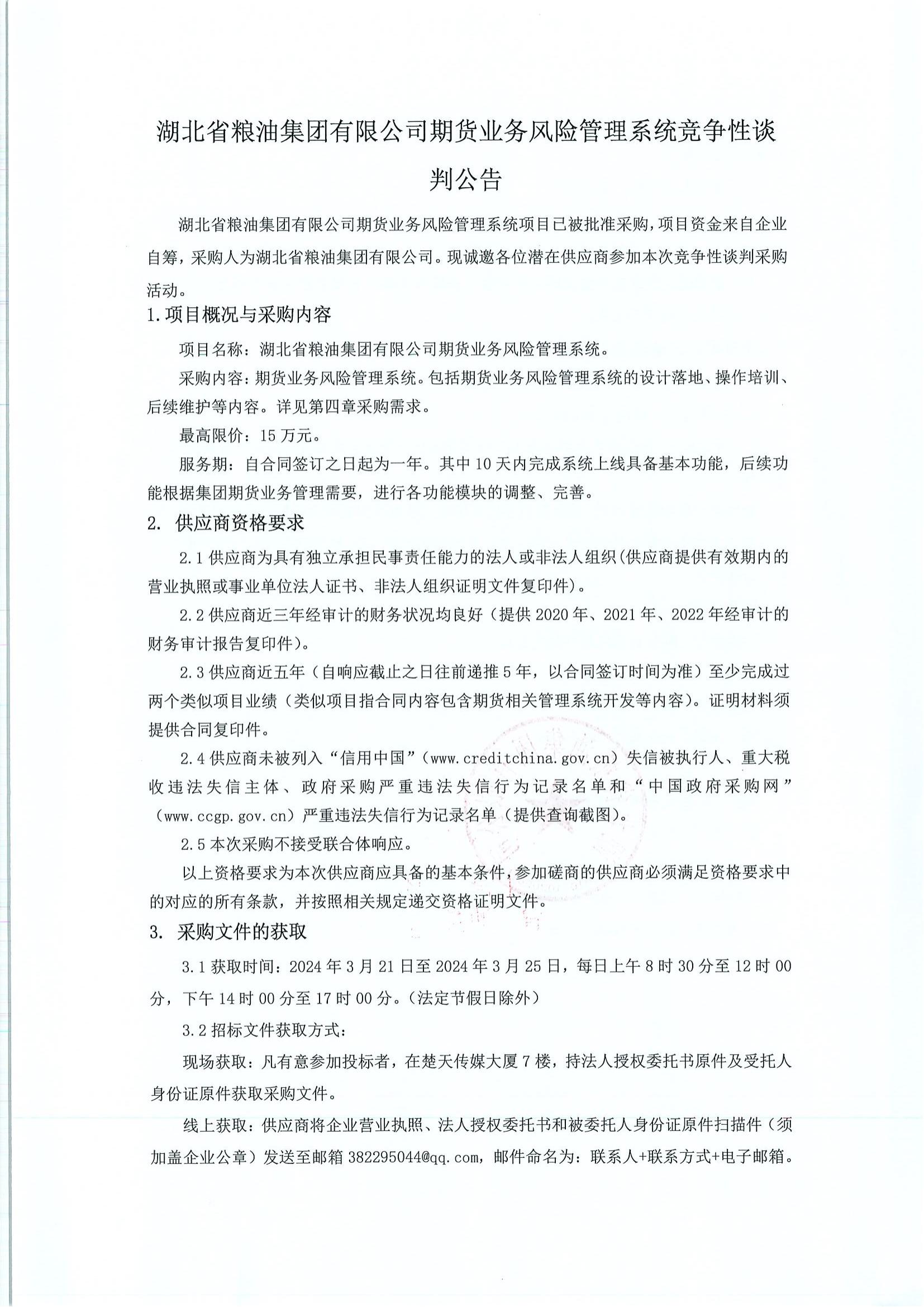 湖北省糧油集團(tuán)有限公司期貨業(yè)務(wù)風(fēng)險(xiǎn)管理系統(tǒng)競爭性談判公告