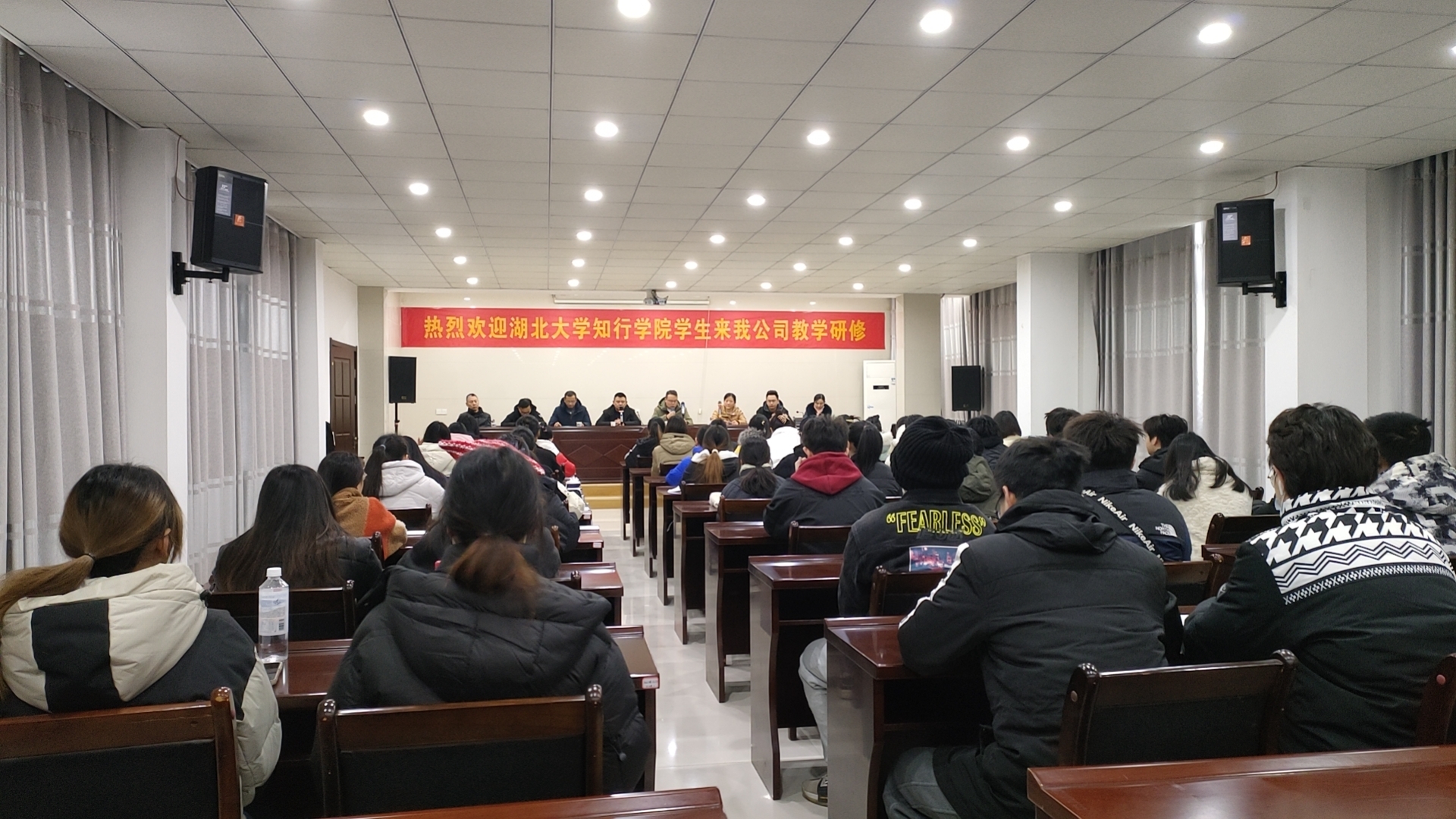 康宏公司各相關(guān)部門負(fù)責(zé)人,湖北大學(xué)知行學(xué)院52名師生參加會議。