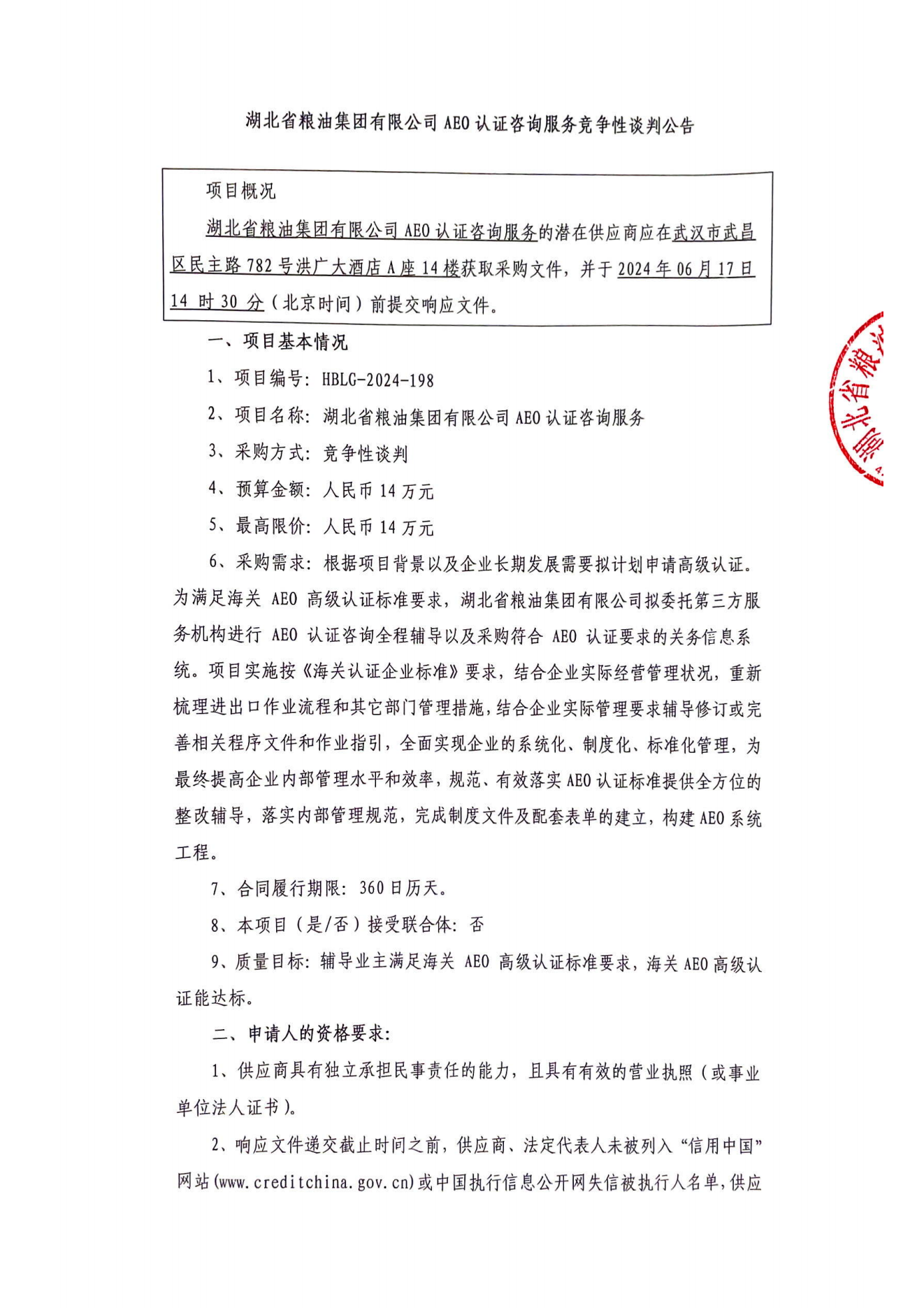 湖北省糧油集團(tuán)有限公司AEO認(rèn)證咨詢服務(wù)競爭性談判公告