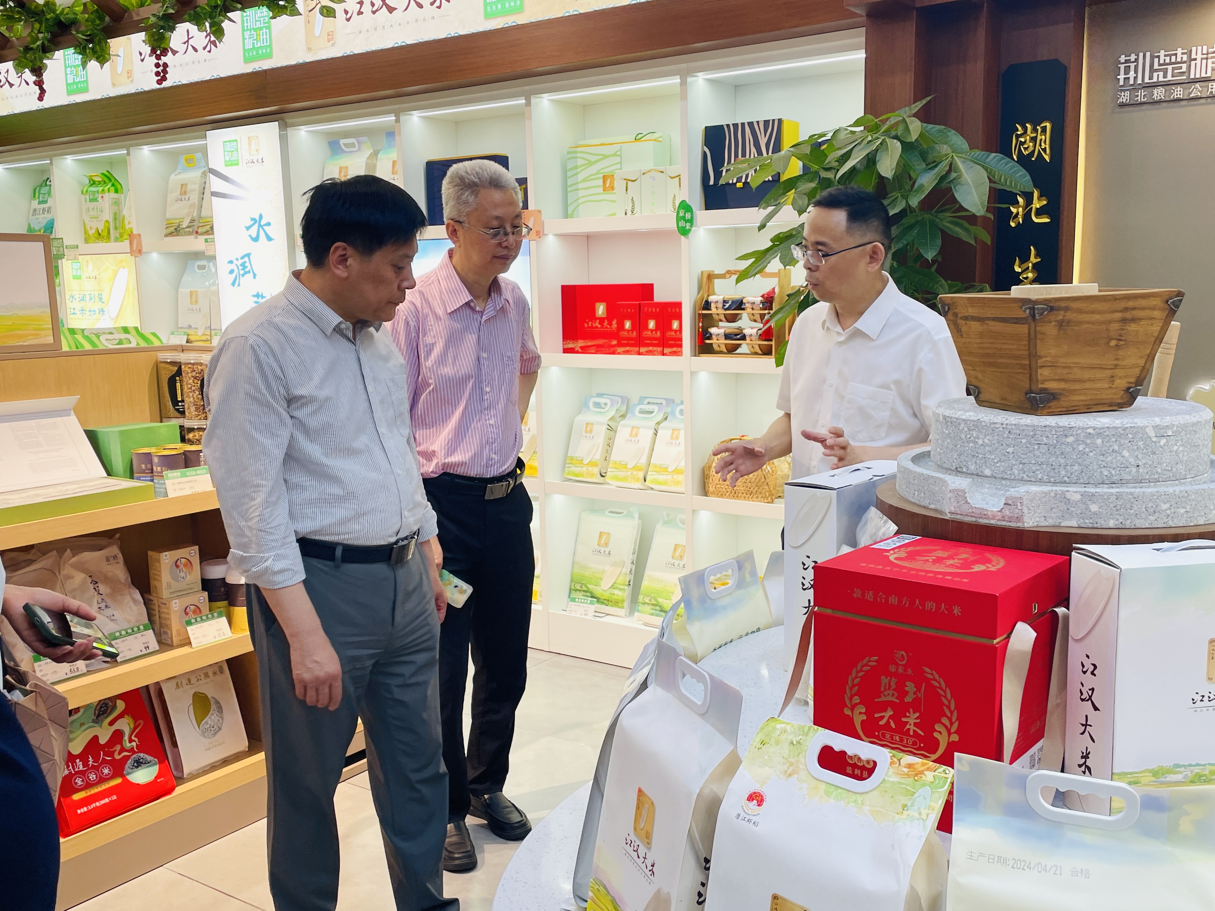 隨后,調(diào)研組參觀了湖北農(nóng)發(fā)集團(tuán)、省糧油集團(tuán)產(chǎn)品展銷中心暨“荊楚糧油”“江漢大米”公用品牌展銷體驗(yàn)中心。這是一個(gè)集展示、體驗(yàn)、銷售、直播、品牌推廣等多功能為一體的綜合型推廣中心,旨在叫響湖北糧油品牌,為消費(fèi)者線上線下展示推介品類齊全、質(zhì)量可靠的湖北糧油產(chǎn)品,目前已在北京、武漢、十堰等省內(nèi)外核心商圈和重點(diǎn)地段相繼建成10家門店。