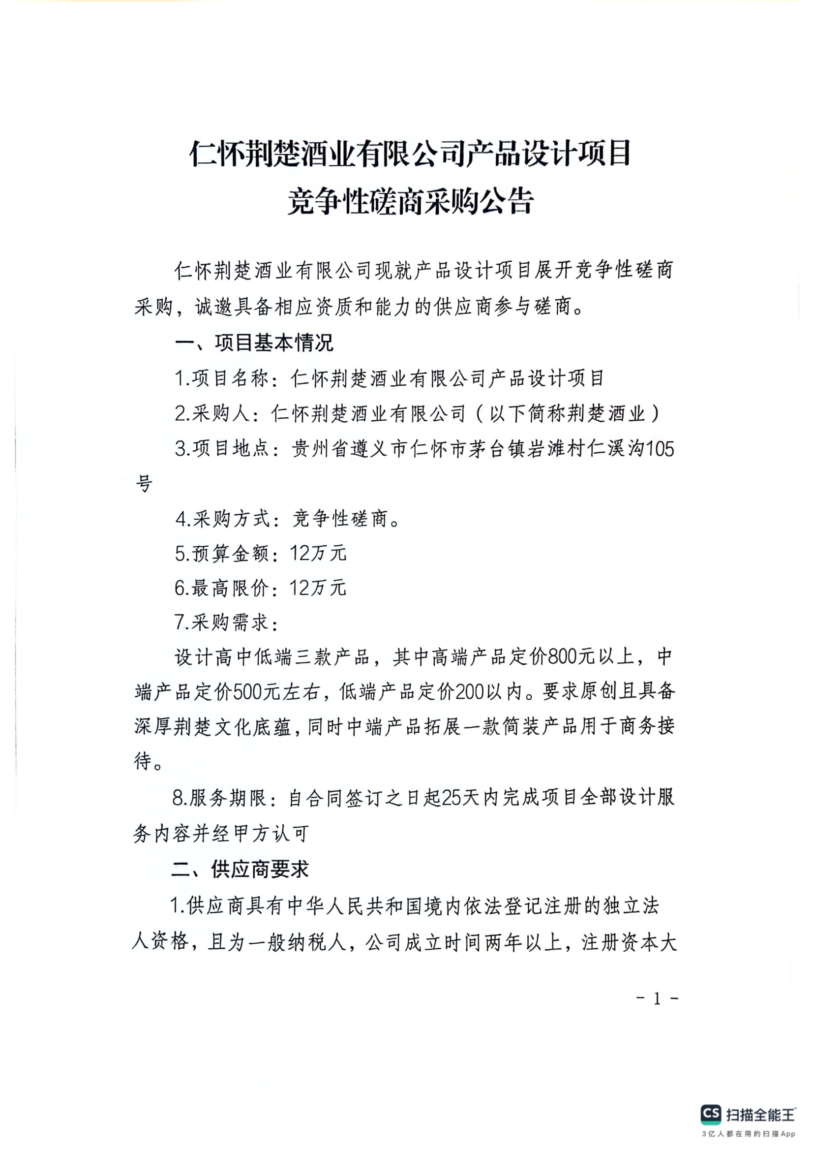 仁懷荊楚酒業(yè)有限公司產(chǎn)品設(shè)計(jì)項(xiàng)目競(jìng)爭(zhēng)性磋商采購(gòu)公告