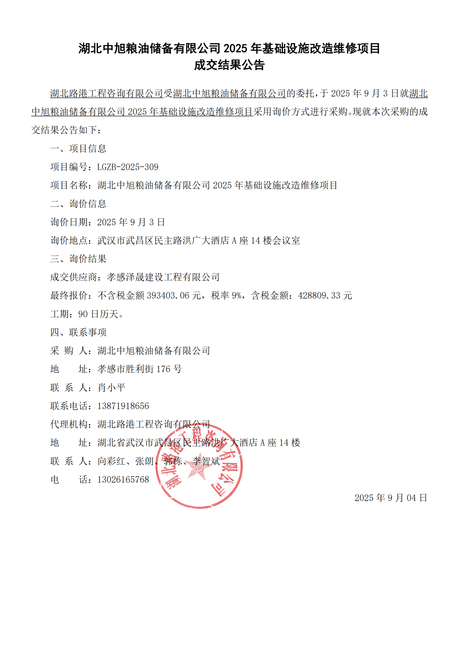 湖北中旭糧油儲備有限公司2025年基礎(chǔ)設(shè)施改造維修項(xiàng)目成交結(jié)果公告