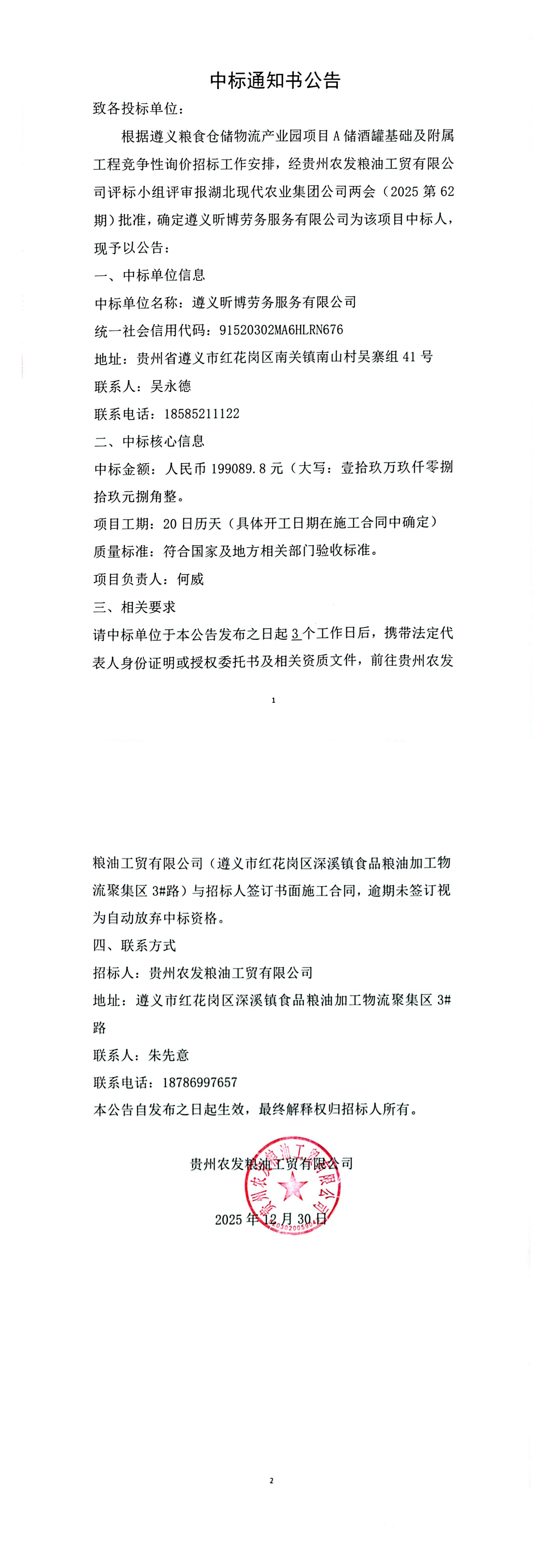 遵義糧食倉(cāng)儲(chǔ)物流產(chǎn)業(yè)園項(xiàng)目A儲(chǔ)酒罐基礎(chǔ)及附屬工程中標(biāo)公告