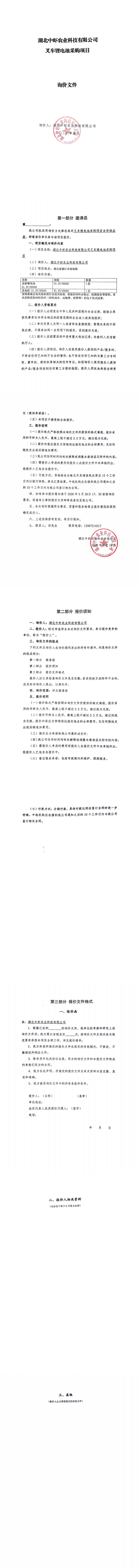 湖北中蝦農(nóng)業(yè)科技有限公司叉車鋰電池采購項目詢價公告