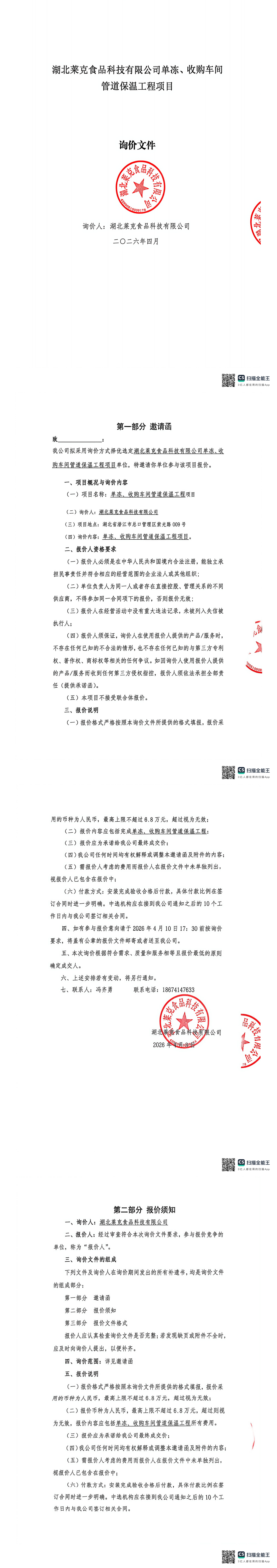 湖北萊克食品科技有限公司工程項(xiàng)目詢價(jià)公告