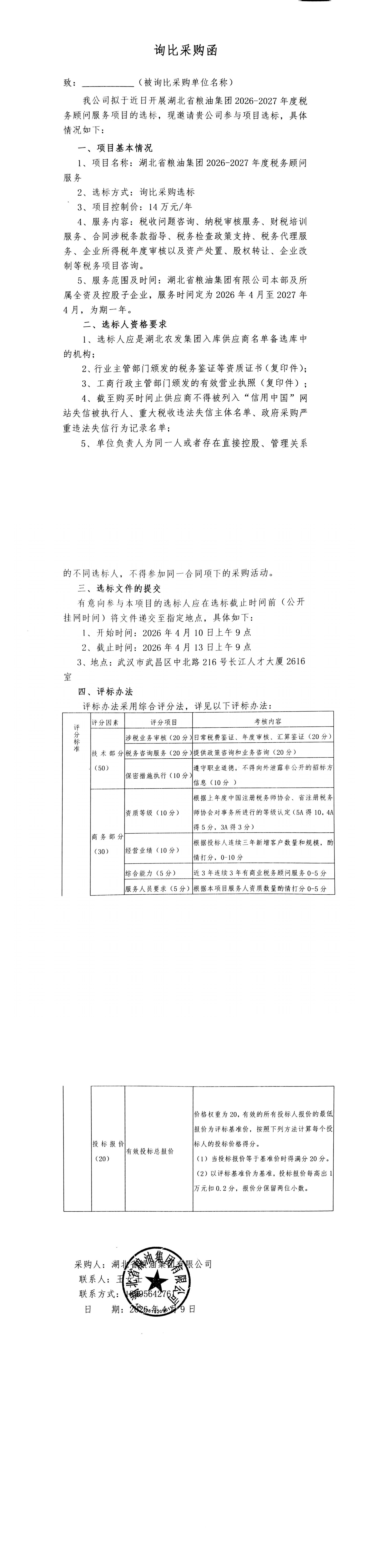 湖北省糧油集團2026-2027年度稅務顧問服務詢價公告
