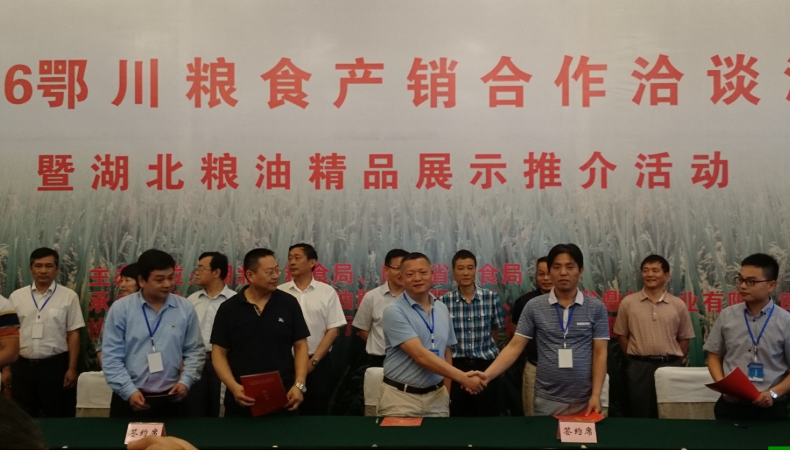 圖為湖北省糧油集團康宏公司與花中花農業(yè)開發(fā)有限公司簽約現(xiàn)場