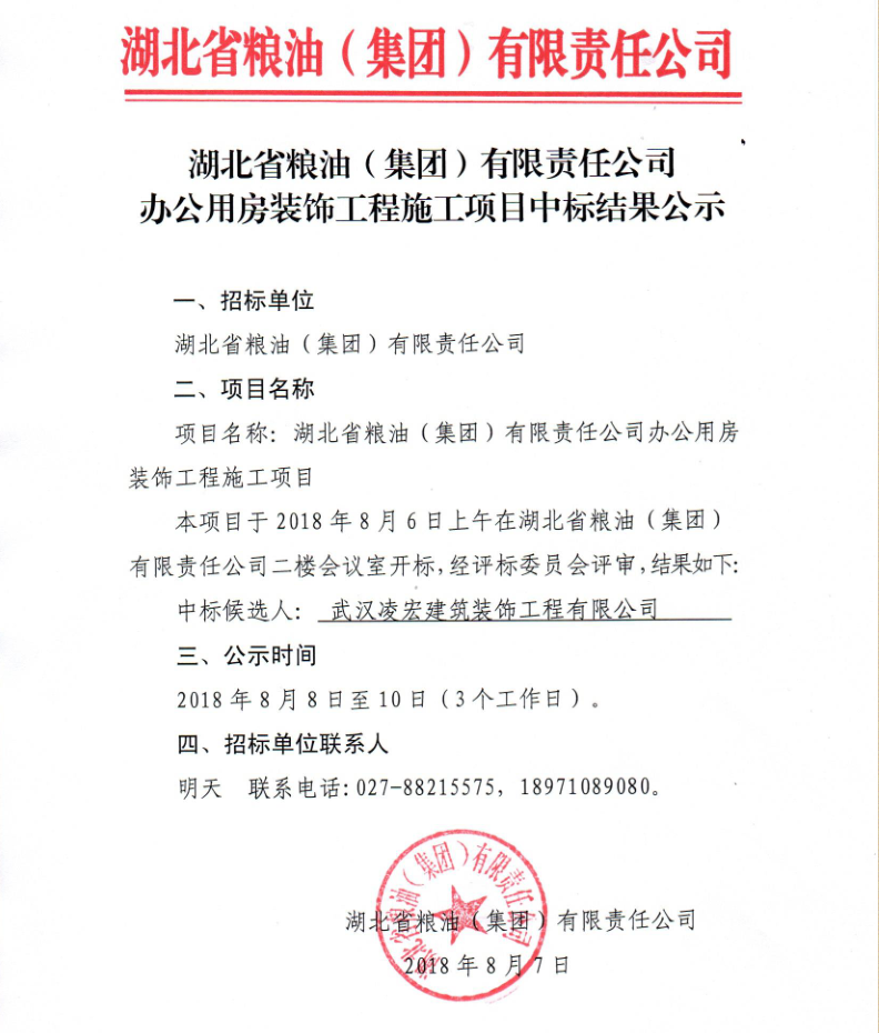 湖北省糧油(集團(tuán))有限責(zé)任公司辦公用房裝飾工程施工項(xiàng)目中標(biāo)結(jié)果公示