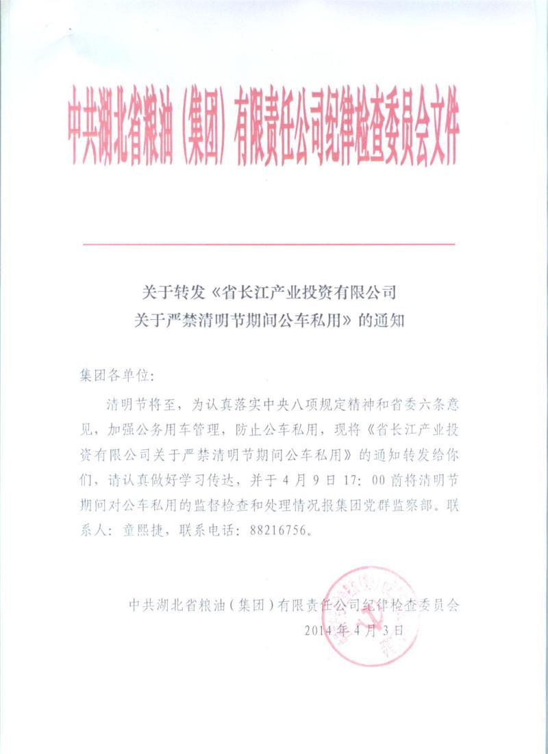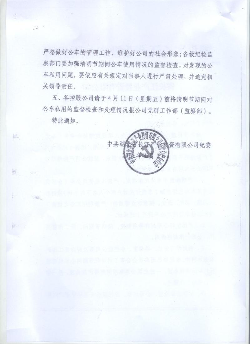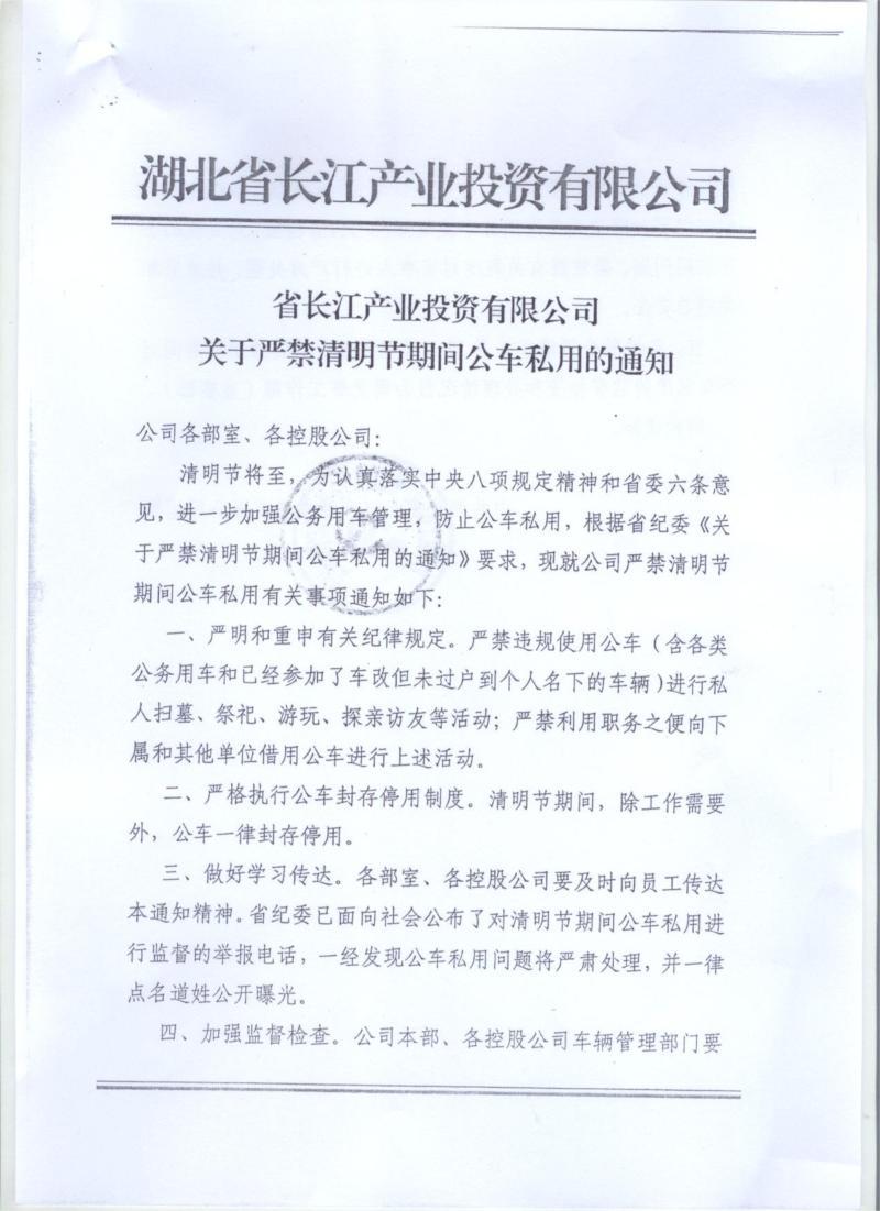 省長(zhǎng)江投資產(chǎn)業(yè)有限公司關(guān)于嚴(yán)禁清明節(jié)期間公車(chē)私用的通知