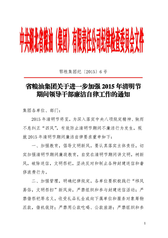 湖北省糧油集團關(guān)于進一步加強2015年清明節(jié)期間領(lǐng)導(dǎo)干部廉潔自律工作的通知